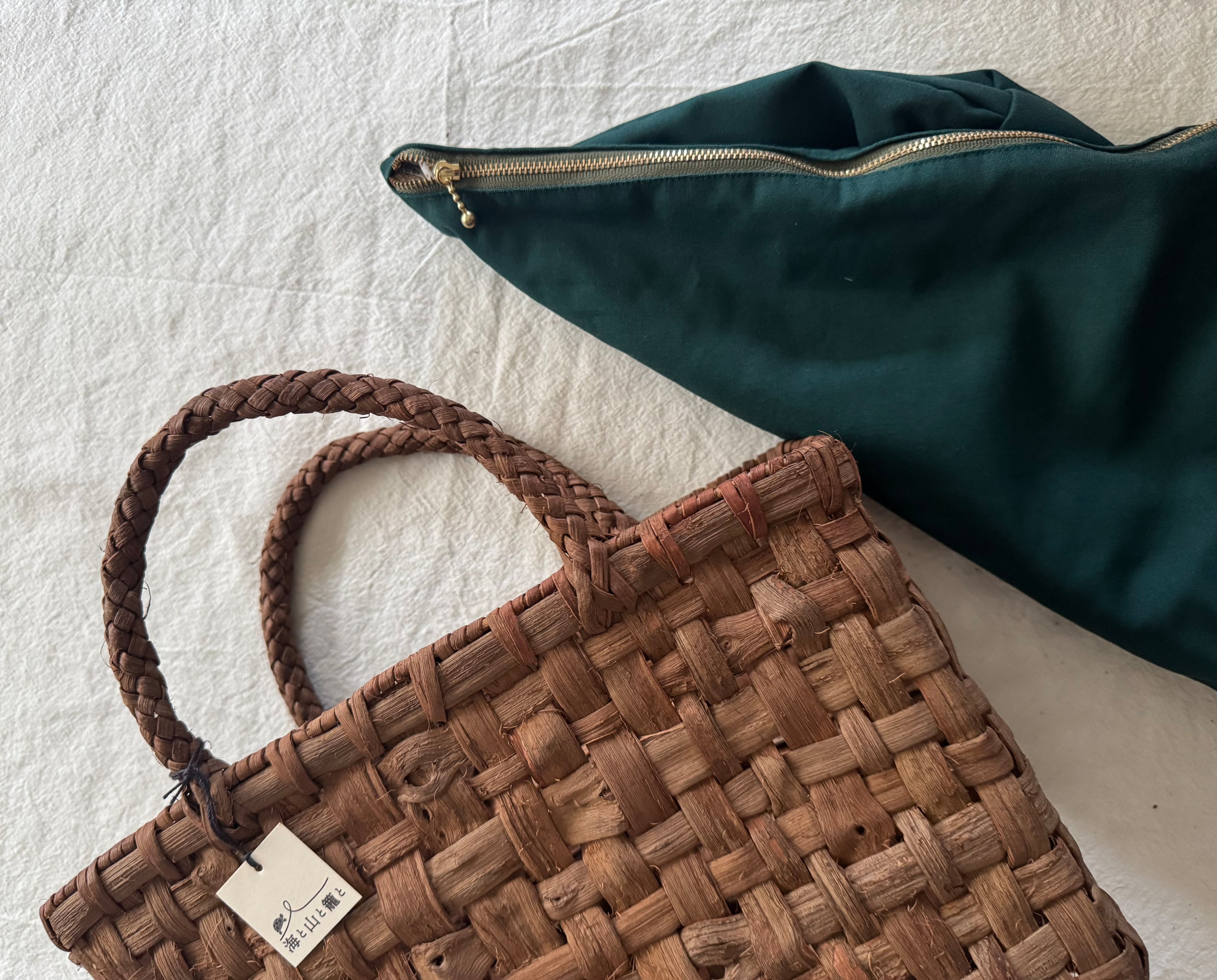 当工房の作品は、すべて国産の山葡萄樹皮を使用しております。主に北海道、群馬県、長野県の山奥に自生する良質の自然素材を一本一本丁寧に編んでおります。