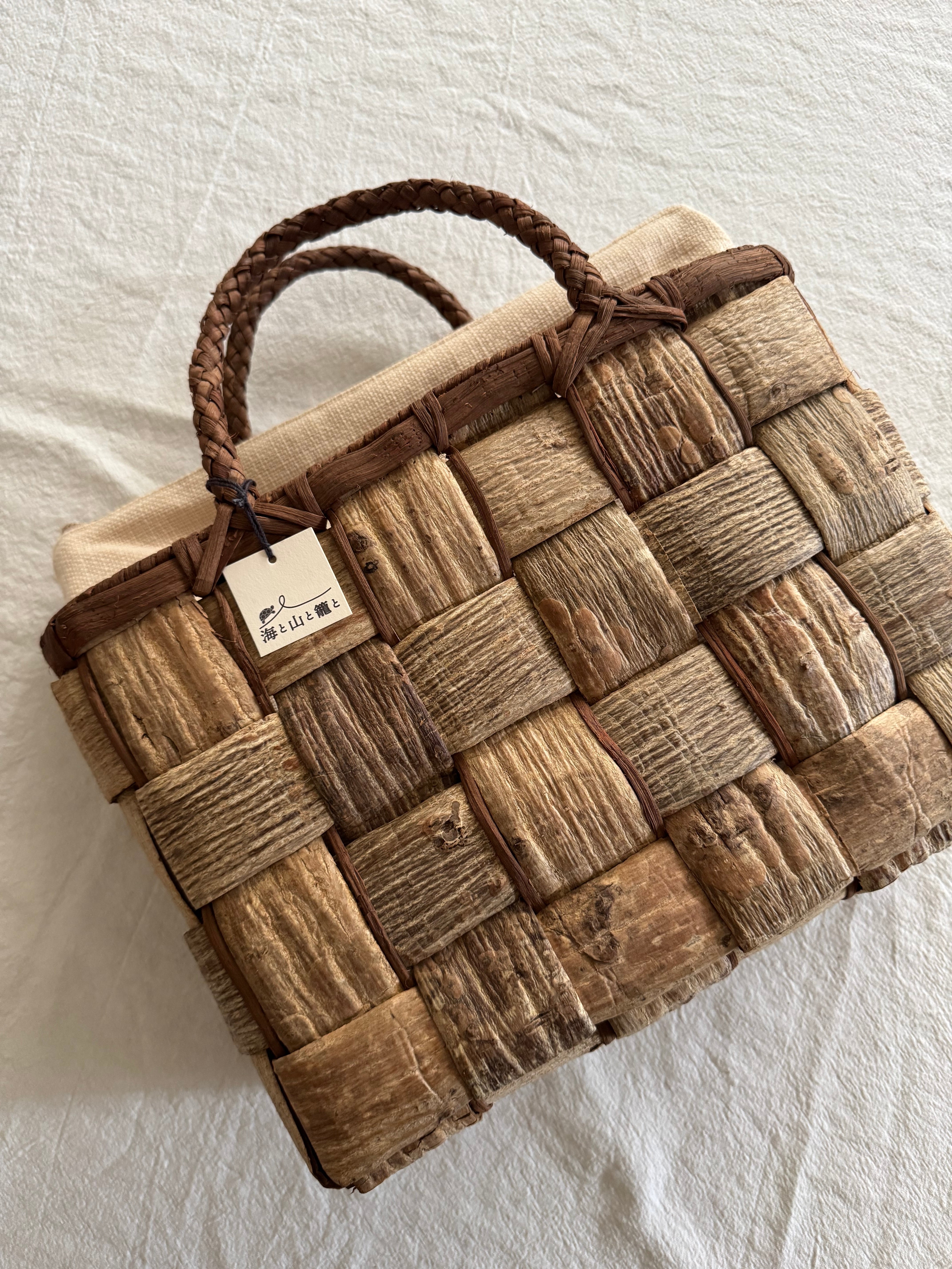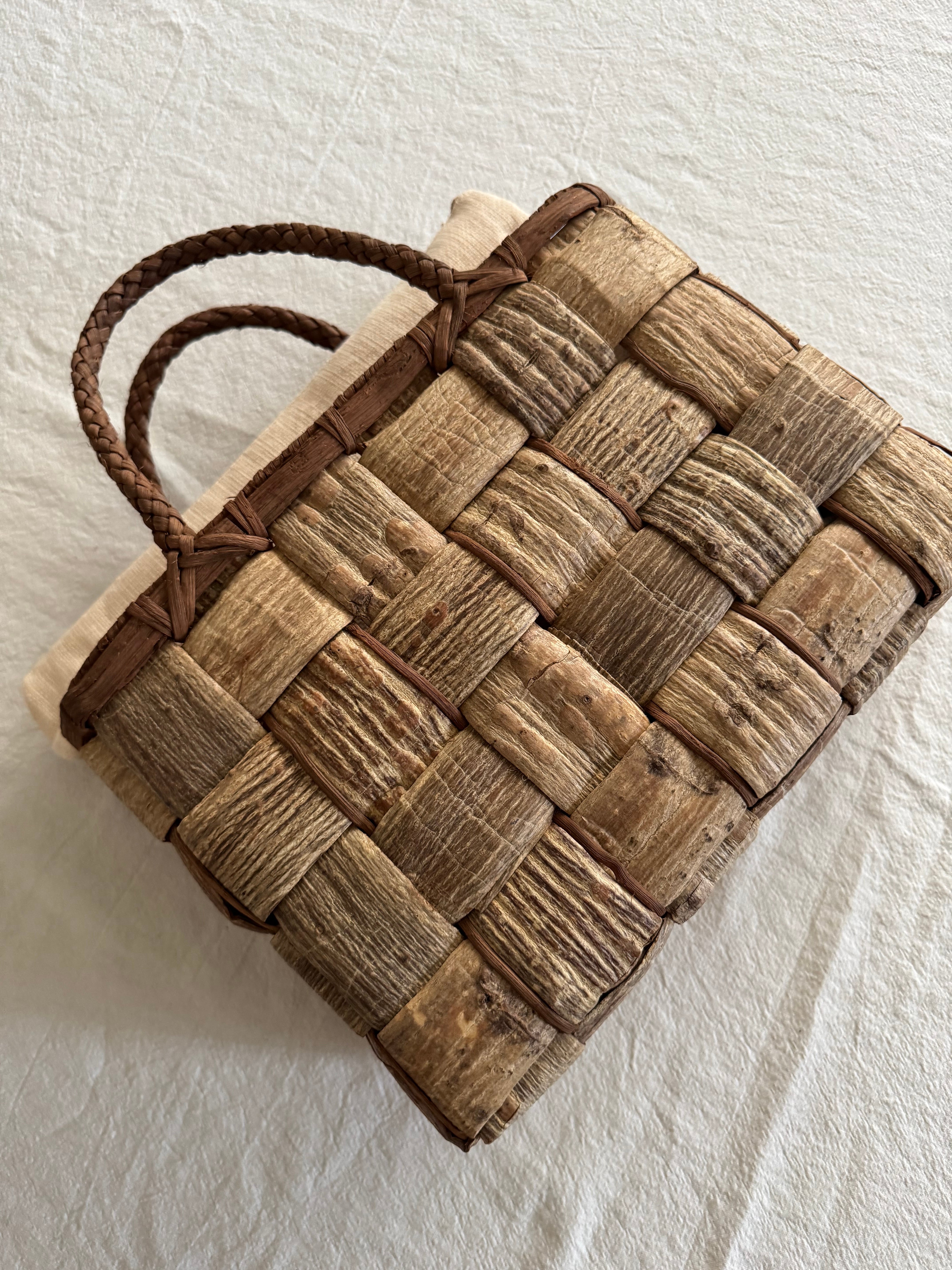 当工房の作品は、すべて国産の樹皮を使用しております。主に北海道、群馬県、長野県の山奥に自生する良質の自然素材を一本一本丁寧に編んでおります。